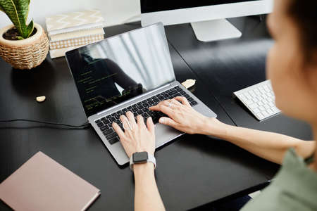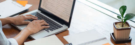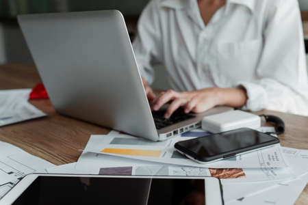 Close-up view of professional businesswoman working on her project while typing on laptop computer in her office room