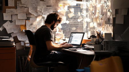 A writer sitting at a desk, typing furiously on a laptop, surrounded by notes and papers