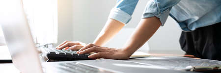 Shot of Man hand using and typing keyboard of laptop computer on office desk. Workspace, businessman working project creative idea for job online network. Business finance and technology concept.