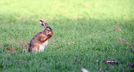 European hare, Lepus europaeus. Wild rabbit on grass.