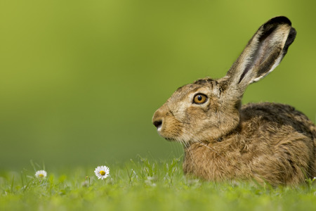 Portrait of brown hare with clear blurred green background. Wild rabbit in grass.