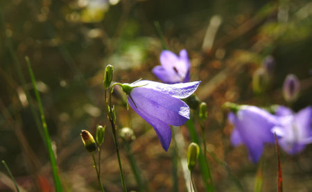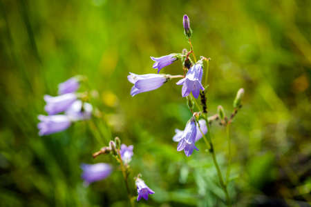 Beautiful blooming wild bluebells or bellflower flowers during sunny summer morning
