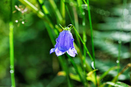 Blooming wild bluebells after rain. Macro image, selective focus. Beautiful summer nature