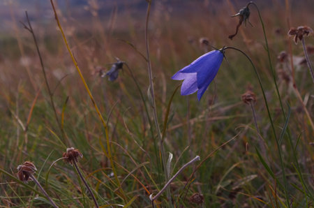 Lilac bells in the field, against the background of the rotten grass. high quality photo