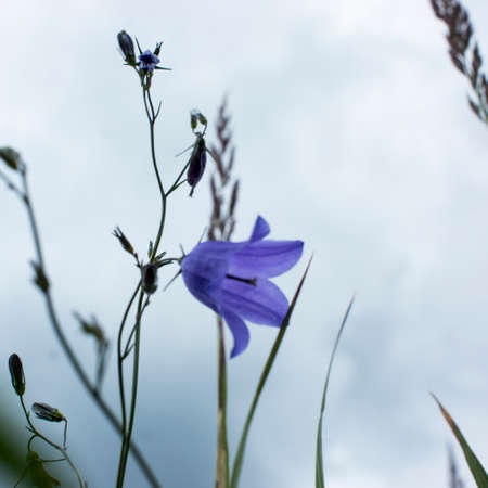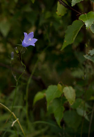 Flower Blue campanula on the edge of the forest. Beautiful wild flower closeup with copy space