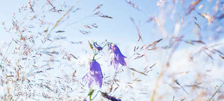 Violet blue bellflowers blooming in a spring meadow against blue sky. Flowering field, plants in summer garden. Floral postcard for congratulations with holidays Wild blossoming field. growing flowers