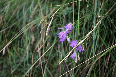 Bellflowers (Campanula sibirica) bloom among wild grasses in summer