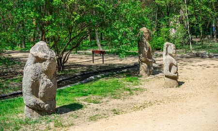 Askania-Nova, Ukraine - 04.28.2019. Ancient stone sculptures in the reserve Askania Nova near Kherson, Ukraine, on a sunny spring day