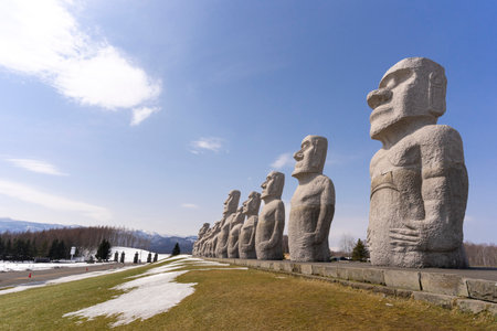 Moai, big stone statue in winter with snow on ground at hill of Buddha in Sapporo, Makomanai takino, Japan.