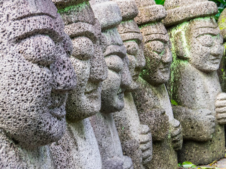 A shot of a row of statues made of rock in Yakcheonsa Temple, Jeju, South Korea