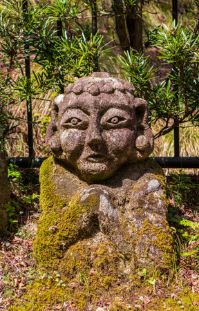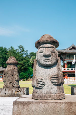 Art sculpture Dol hareubangs figure or tol harubangs statue symbol of jeju island in Sanbangsa Temple for korean people and foreign travelers travel visit at Seogwipo city in Jeju do, South Korea