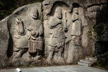 Impressive stone carvings in the natural cave at Seokbulsa Temple traditional temple in the mountains in Busan South Korea