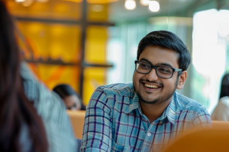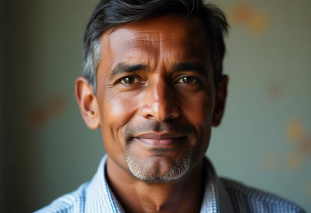 A middle-aged man from India exhibits a warm smile, reflecting contentment and peace. With a backdrop of soft colors, he seems to embrace the calmness of his surroundings.