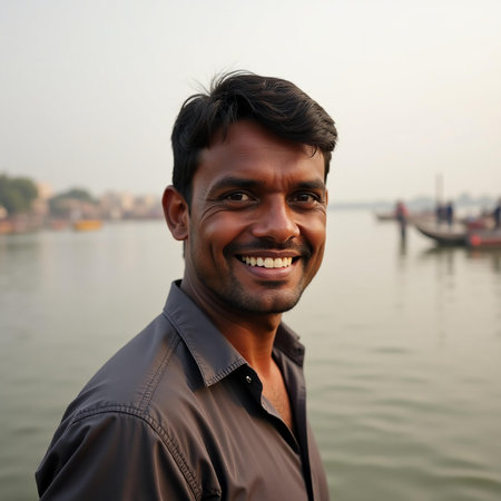 A man stands joyfully by the banks of the Ganges river in Varanasi, showcasing a warm smile that reflects the tranquility and cultural richness of the surroundings at dawn.