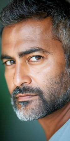 Thoughtful Portrait of a Mature Man with Salt and Pepper Hair and Intense Gaze.