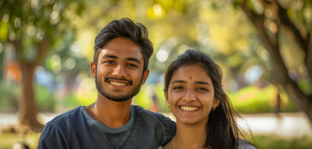 Happy Indian couple enjoying coffee together in a cozy outdoor setting during a sunny afternoon