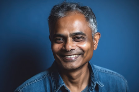 portrait of a smiling man of indian ethnicity against a blue wall background