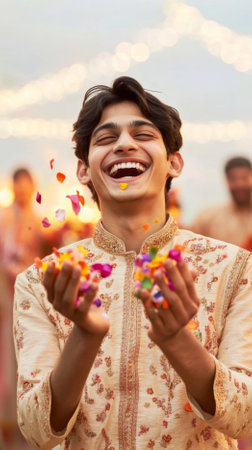 Indian man throwing flower petals during Holika Dahan and Holi festival celebration, AI Generated