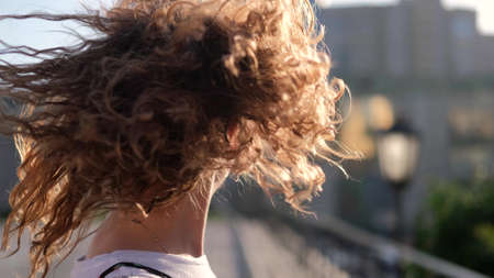 Woman with long, flowing hair is captured motion, creating dynamic and energetic scene. hair appears to be flying around her, showcasing movement and freedom. background is softly blurred