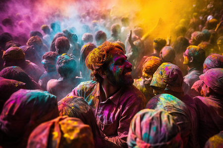 Colorful Powder Covered Crowd Celebrating Together in Unity and Joy, Colorful Holi festival in India, with people throwing colored powders at each other, AI Generated