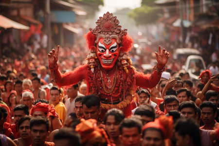 a mass celebration of Nyepi day in Indonesia and a large statue of the god.