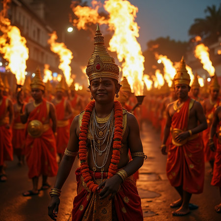 Vibrant festival atmosphere with a colorful temple procession under umbrellas in a crowded Indian street.