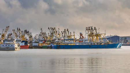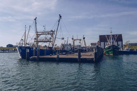 Oudeschild,Texel, The Netherlands, October 13, 2018: moored fishing trawlersat pier