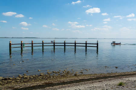 Coastline in zeeuwse village Yerseke with famous oysters and mussels wells during low tide, Zeeland, Netherlands