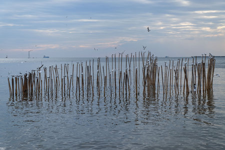 A flock of seagulls perched on a bamboo tree in the middle of the sea.