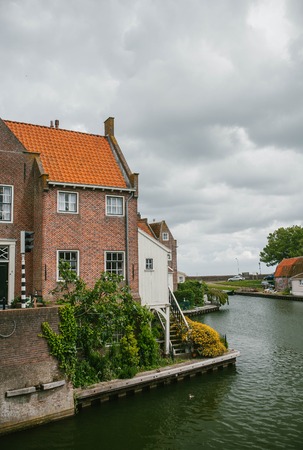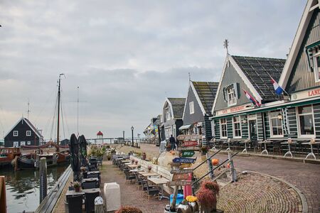 Walking on sunny spring day in small Dutch town Marken with wooden houses located on former island in North Holland, Netherlands
