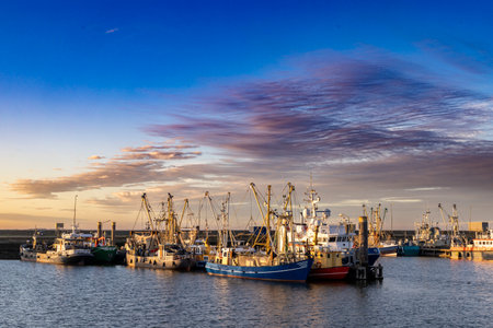 Sunset landscape of Dutch harbor Lauwersoog with fishing ships long the Waddensea in Groningen the Netherlands