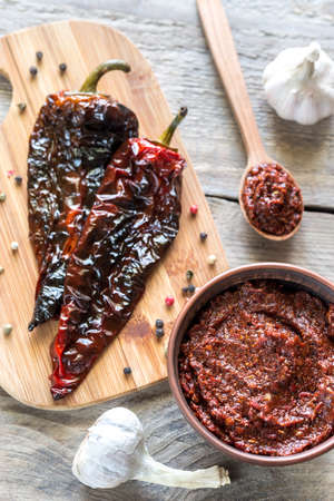 This image features a bowl of rich red chili paste on a wooden surface, showcasing dried peppers. Perfect for culinary projects, it highlights vibrant colors and textures.