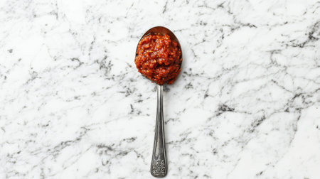 A spoonful of rich and flavorful homemade tomato sauce is elegantly displayed on a silver spoon against a chic marble background, highlighting culinary artistry.