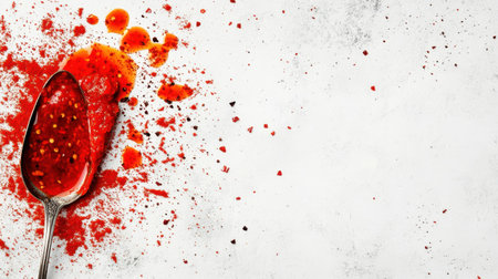 A stunning composition featuring vibrant red sauce and various spices scattered on a white background, enhanced by a silver spoon. Perfect for culinary themes.