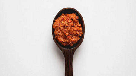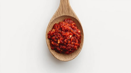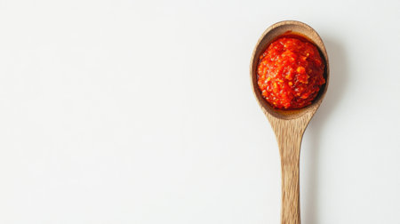 A vibrant red chili paste carefully placed in a wooden spoon against a clean white backdrop. Ideal for culinary photography, showcasing fresh ingredients.