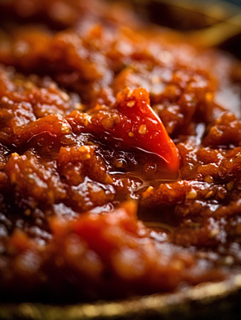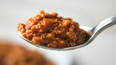 This image showcases a close-up view of a flavorful spoonful of rich, spicy condiment made from a blend of savory ingredients and unique spices.