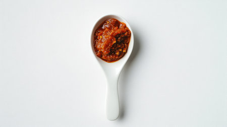 This image showcases a vibrant, spicy red sauce placed in a sleek white spoon against a minimalistic background, ideal for food-related themes.