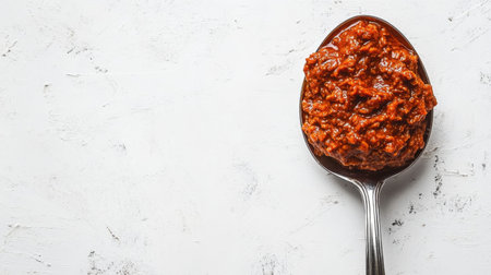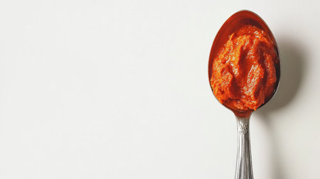 A closeup image featuring a rich red tomato paste elegantly placed on a vintage spoon against a blank white background, perfect for culinary use.