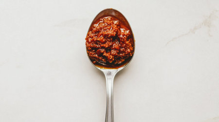 A close-up view of a spoonful of rich red chili paste resting on a light marble surface, showcasing its vibrant texture and flavor ideal for cooking.