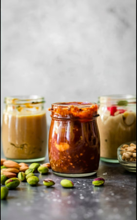 different types of sauces in glass jars. with pistachios, cashews and vegan mayo on a stone background