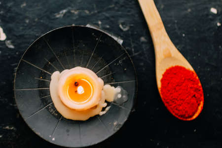 curry paste and red chilli peppers background / ingredients table asian food spicy in thailand