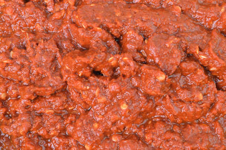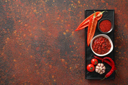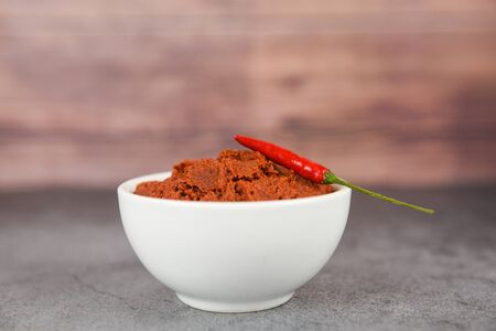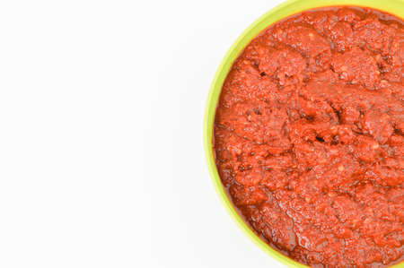 Traditional Maghrebi hot chili pepper sauce paste harissa. Tunisia and Arabic cuisine adjika. Image contains copy space