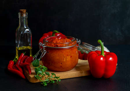 Roasted Red Pepper Relish ajvar or aivar. traditional Balkan vegetable caviar, lutenitza, pingjur with ingredients.