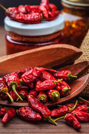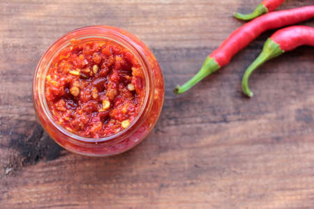 Fresh fed hot chili peppers and canned sauce in glass jar on wooden table background. Top view, copy space