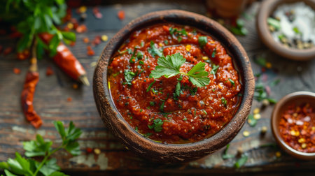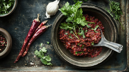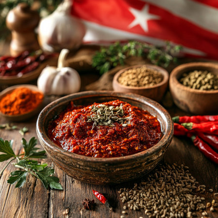 A richly aromatic bowl of authentic Turkish harissa, garnished with fennel seeds, chilies, and garlic, juxtaposed against a backdrop of traditional spices, evoking mediterranean flavors.