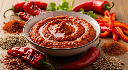 Spicy harissa sauce with red peppers and aromatic spices on wooden table