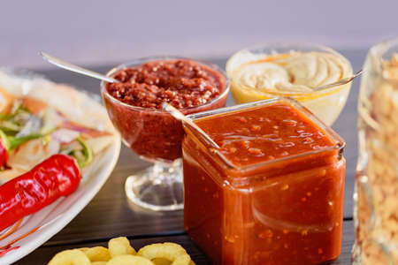 Hot chili pepper sauce paste harissa close up. Healthy spicy, creamy vegetarian appetizer or snack with roasted red pepper on wooden background. Set of spices and sauces. Plate of hummus. Street food