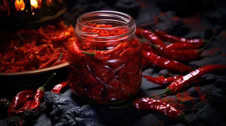 A visually striking composition featuring a glass jar filled with vibrant chili flakes, surrounded by spices on a dark background, perfect for culinary presentations.