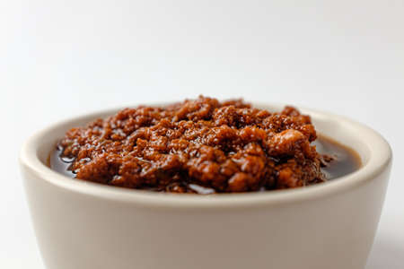 A rich and savory condiment displayed in a clear glass bowl, set against a clean white background. Ideal for culinary art, food styling, and recipe use.