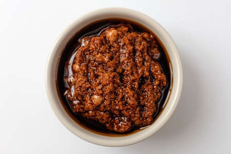 Schezwan Sauce / Szechuan chutney is an important ingredient in Chinese recipe. served in a bowl, isolated. selective focus